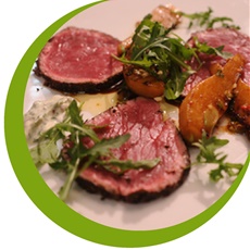 Snijd dunne plakjes van het rundvlees en schik ze op de borden. Verdeel de peertjes over het vlees en werk af met het sausje. Bedruppel het geheel met wat marinade en versier het bord met rucola.