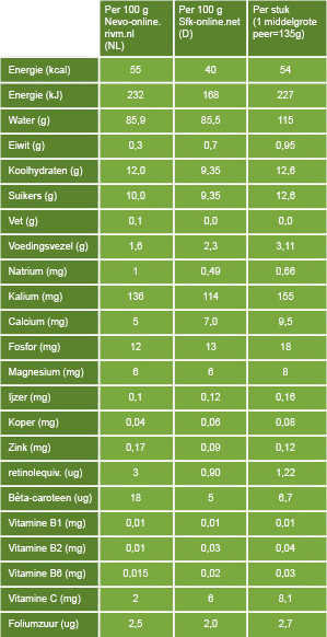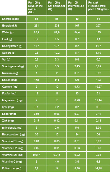De schil van een peer bevat heel wat gezonde voedingsstoffen. Was eventueel de peer voor gebruik en laat de schil eraan. Vergelijk het verschil in waarden met behulp van de twee tabellen hieronder